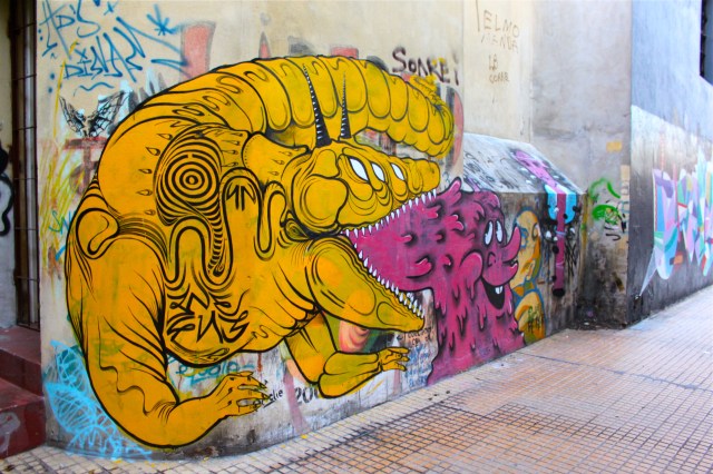SUNDAY: I was still having trouble adjusting to the time difference and woke up at 4pm, whoops. Most of you who know me probably aren’t surprised that I woke up so late, however before I came here I had adjusted back to a normal sleeping schedule. I swear! So I grumbled, got up, took a shower, ate some food, played “how do I get you outta my room” with the cat for a few minutes and ventured into the emerging twilight to check out the San Telmo sunday market. I took the “subte” part of the way. The cool thing about the subway in Buenos Aires is that it’s the 3rd oldest system in the world, and the ONLY one with the original cars from 1913 still running on the track. I didn’t get a good picture (I didn’t want to scream tourist) but here’s one online. I got off and happened to walk down a street with some outstanding examples of the enchanting street art here in BA. Que suerte! This is the whole album, and here are two of my favorites: