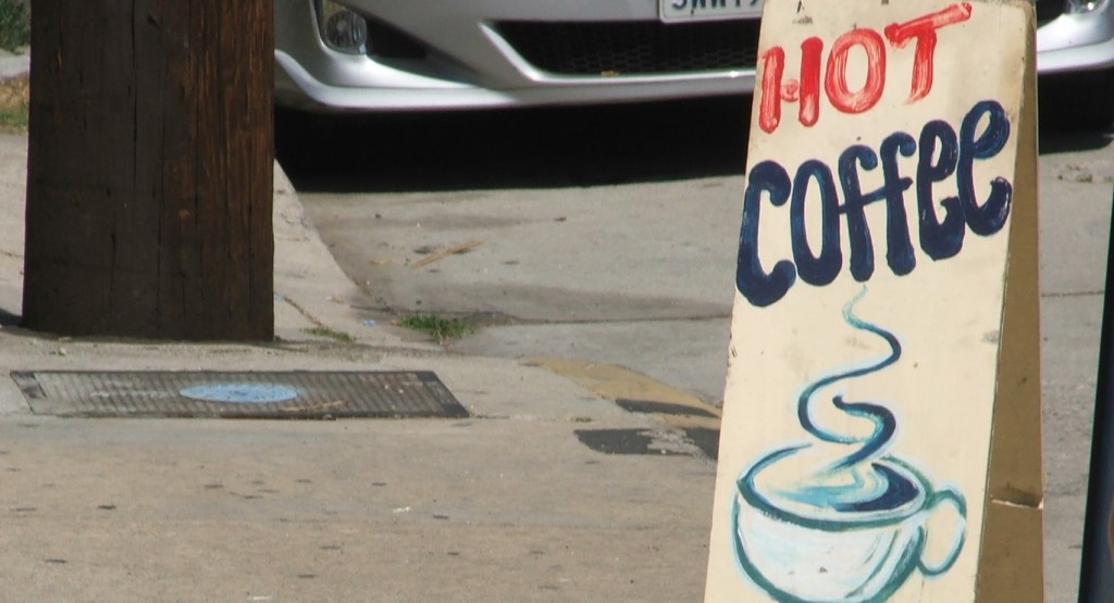 Scene takes place outside of a Pete’s Coffee.