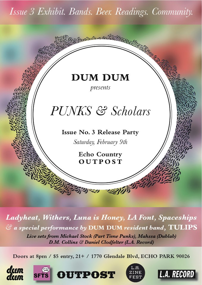 | Issue 3 Exhibit. Bands. Beer. Readings. Community.Readings from the 3rd Issue by Dummies: D.S. Chun, Liska Jacobs, Taleen Kalenderian, Jessica Garrison, and Michael Stock.R O A M I N G R E A D I N G SLIVE PUNK SETS FROM: Michael Stock (Part Time Punks), Mahssa (Dublab) D.M. Collins & Daniel Clodfelter (L.A. Record) BANDS: Ladyheat, Withers, Luna is Honey, LA Font, Spaceships, & a special performance by DUM DUM’s resident band: TULIPS More details to follow! |